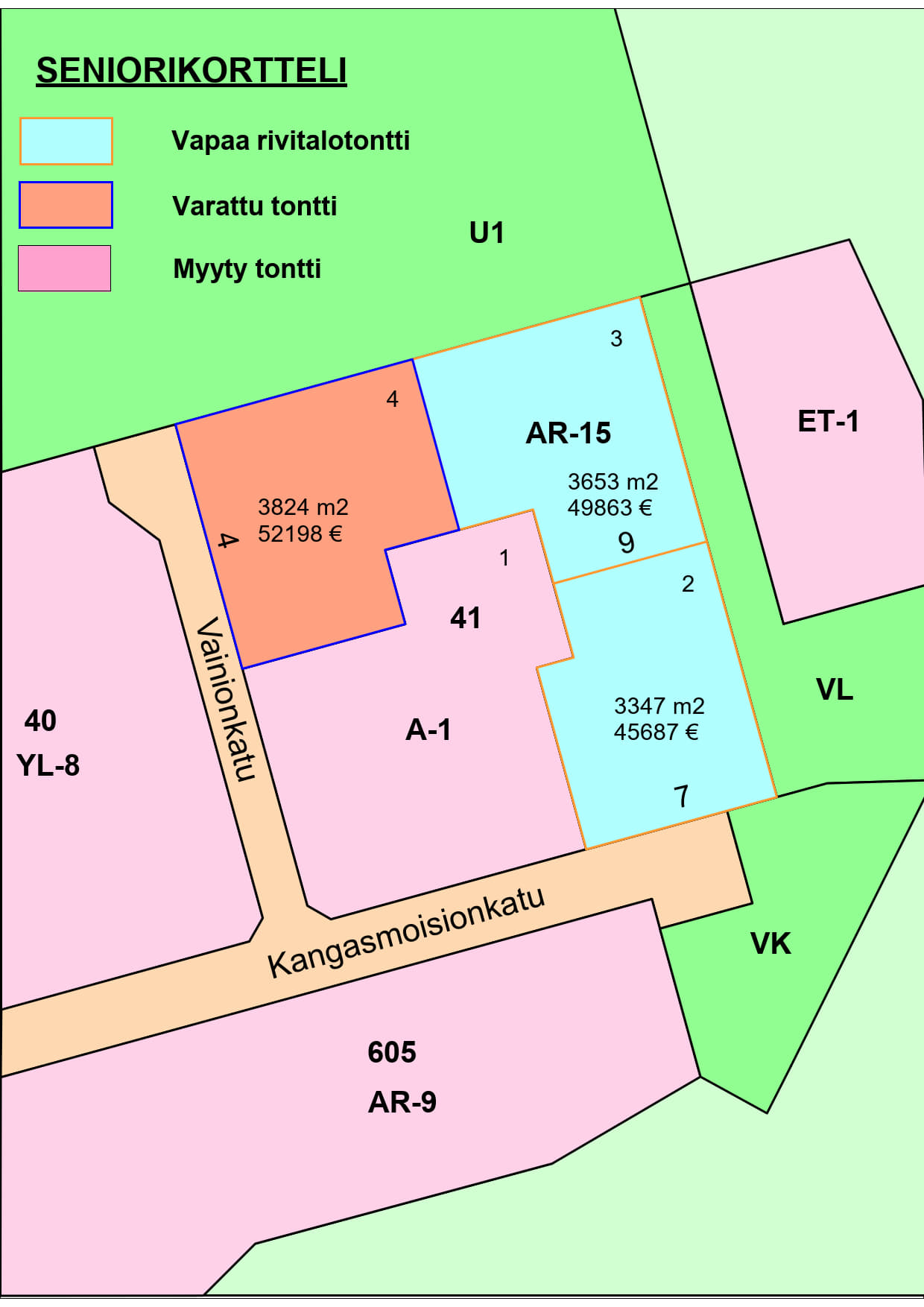 Kangasmoisionkadulla on myynnissä kolme rivitalotonttia.