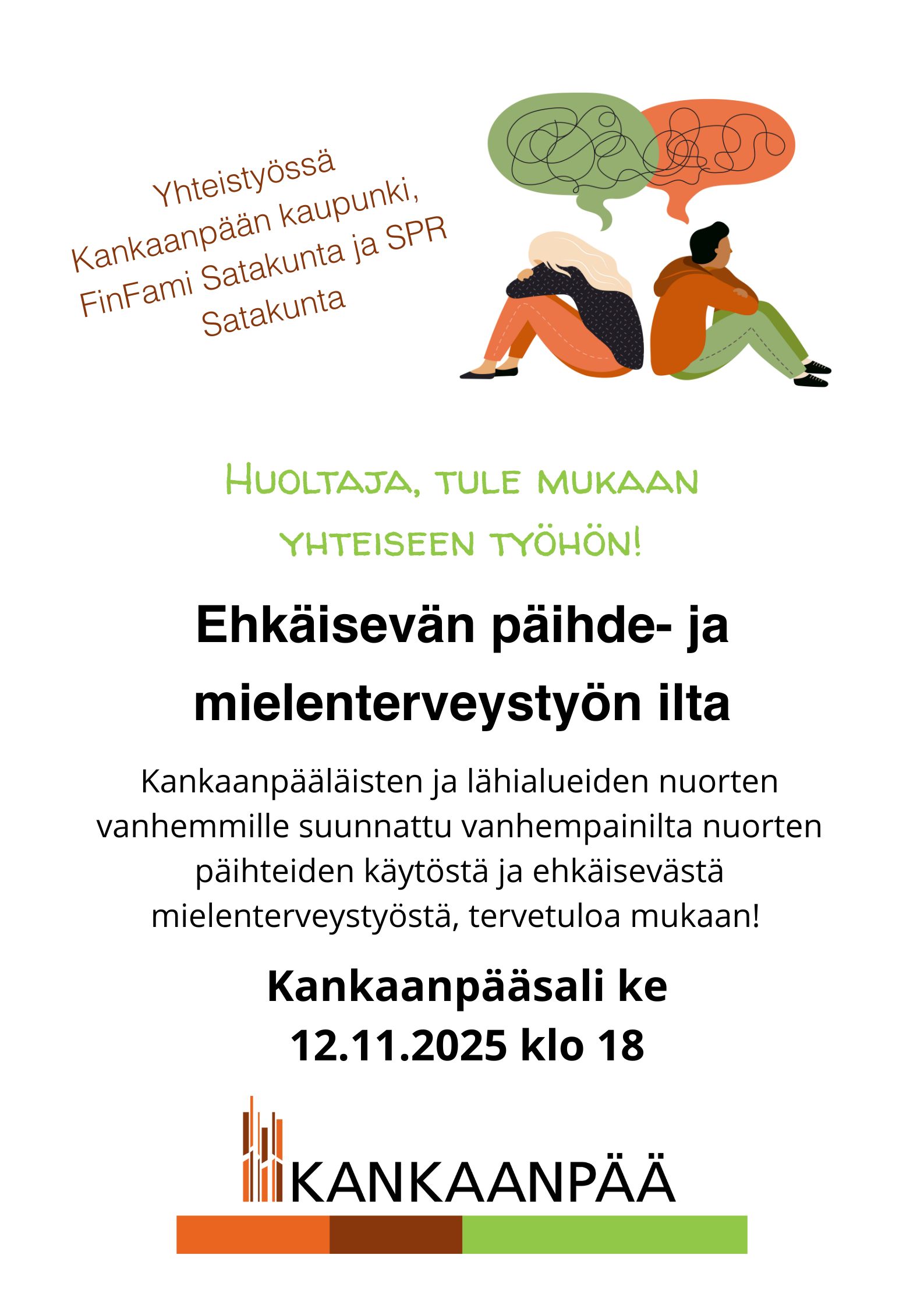 Kankaanpään kaupunki järjestää yhteistyössä FinFami Satakunnan ja SPR Satakunnan kanssa vanhempainillan keskiviikkona 12. marraskuuta 2025 kello 18 Kankaanpääsalissa (Kangasmoisionkatu 1). Vanhempainillassa syvennymme lasten ja nuorten hyvinvoinnin ajankohtaisiin haasteisiin ja siihen, miten vanhemmat ja muut aikuiset voivat tukea heitä arjessa. Asiantuntijat tarjoavat tietoa ja näkökulmia huoltajille liittyen päihteiden käyttöön ja mielenterveyden haasteisiin. Illan aikana kuullaan myös huoltajan kokemuspuheenvuoro ja kuulijoilla on mahdollisuus kysyä neuvoa asiantuntijoilta.