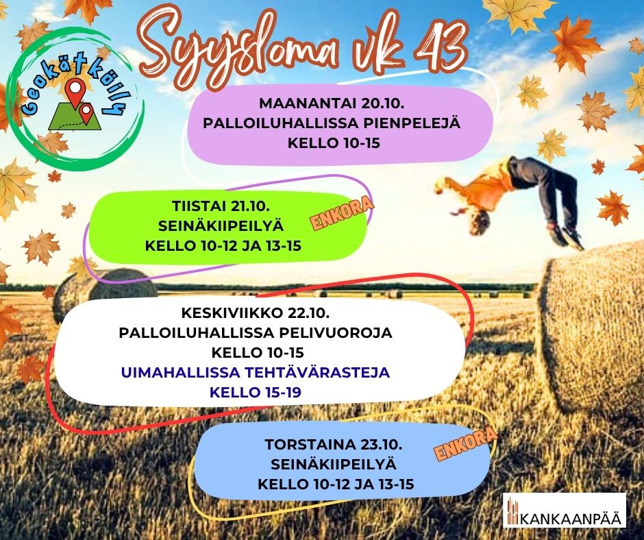 - to 23. lokakuuta kello 10–12 ja 13–15 seinäkiipeilyä palloiluhallin kiipeilyseinällä